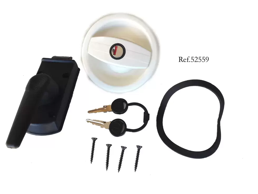Cerradura redonda para arcon ó puerta de caravana ó autocaravana de color blanca.