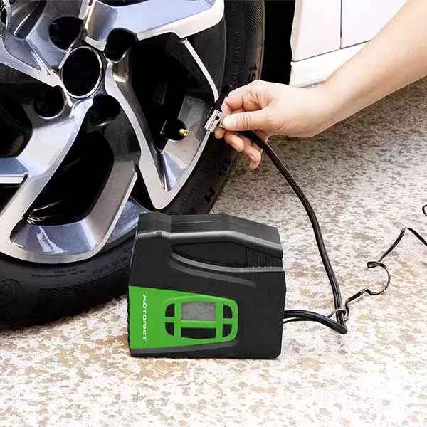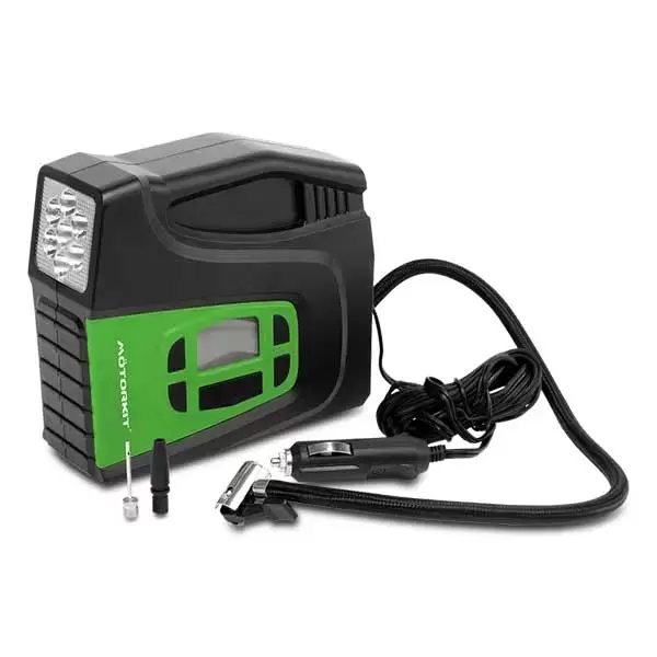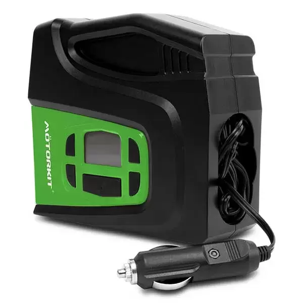 Compresor digital de 120W, inflado en tan sólo 5 minutos (0-35 psi), con indicador digital, ajuste seguro al neumático, medidor grande y de fácil lectura; cable cómodo y compartimiento para guardarlo; adaptadores incluidos para inflar balones, juguetes y otros articulos inflables.
