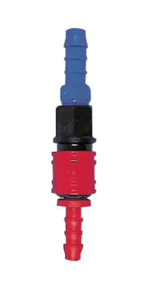 El conector funciona de la siguiente forma: la tubería que trae el agua se conecta en el extremo de color azul y en el extremo rojo el tubo del que queremos sacar agua, cuando desconectamos el tubo rojo con un simple clik corta el agua automaticamente sin que se produccan escapes de agua.