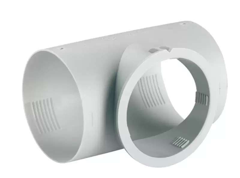 Conector para tubo calefacción de 65mm en forma de T siento la boca central para dar salida al difusor de aire con trampilla Ref.72143