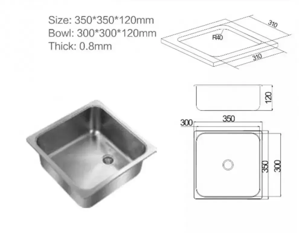 Fregadero cuadrado de acero inoxidable 350x350 para caravanas, autocaravanas y camper.