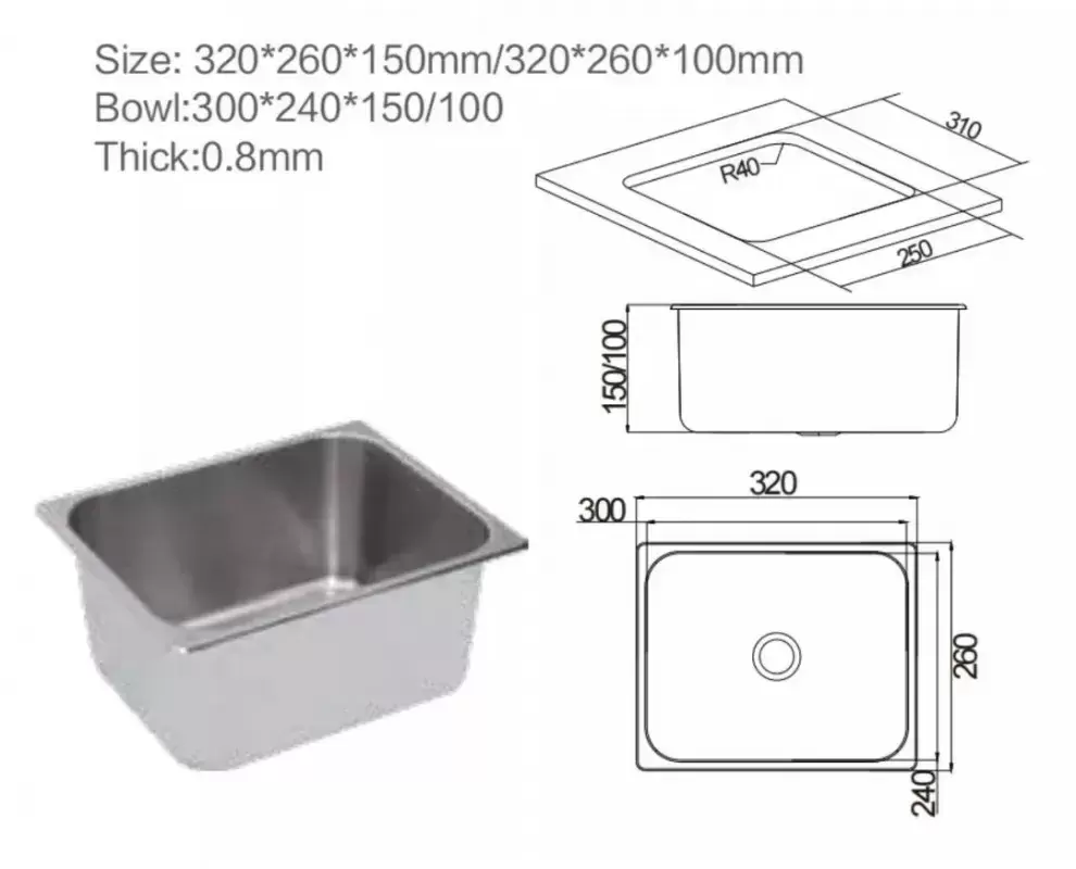 Fregadero rectangular de acero inoxidable 320x260 para caravanas, autocaravanas y camper.