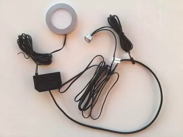1 luz led 12v de 2.7w luz 6000K de medidas 7.1cm exterior y 8mm de altura para instalacion en superficie y 2 metros de cable.