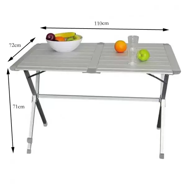 Mesa de aluminio Midland para cuatro personas que se puede desmontar y almacena en un saco con unas medidas de 110 de largo x 22 de diámetro.
