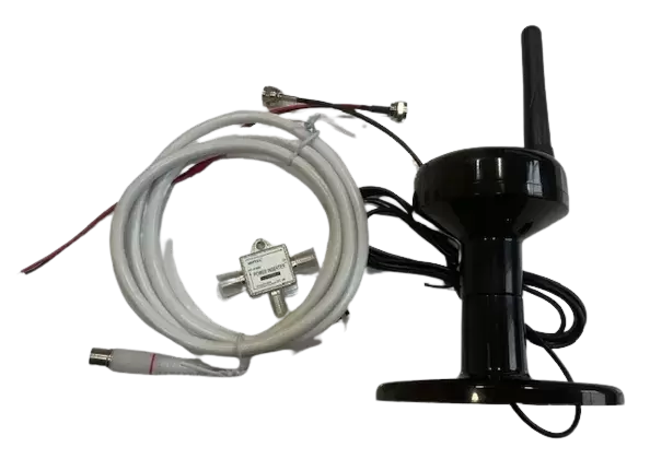 Incluye amplificador y cable RG174 de baja pérdida de 2 metros, con conector macho tipo F y entrada de alimentación.