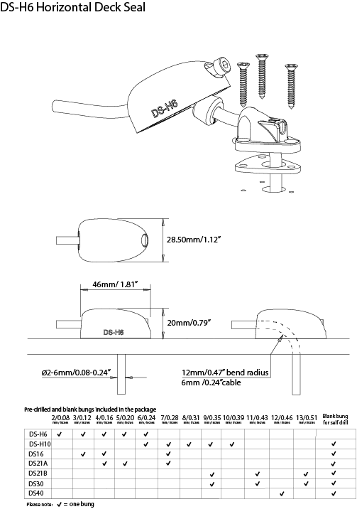 Se suministra en un blíster junto con 5 gomas de ajuste de distintas medidas de orificios para poder insertar el cable deseado según medidas indicadas.