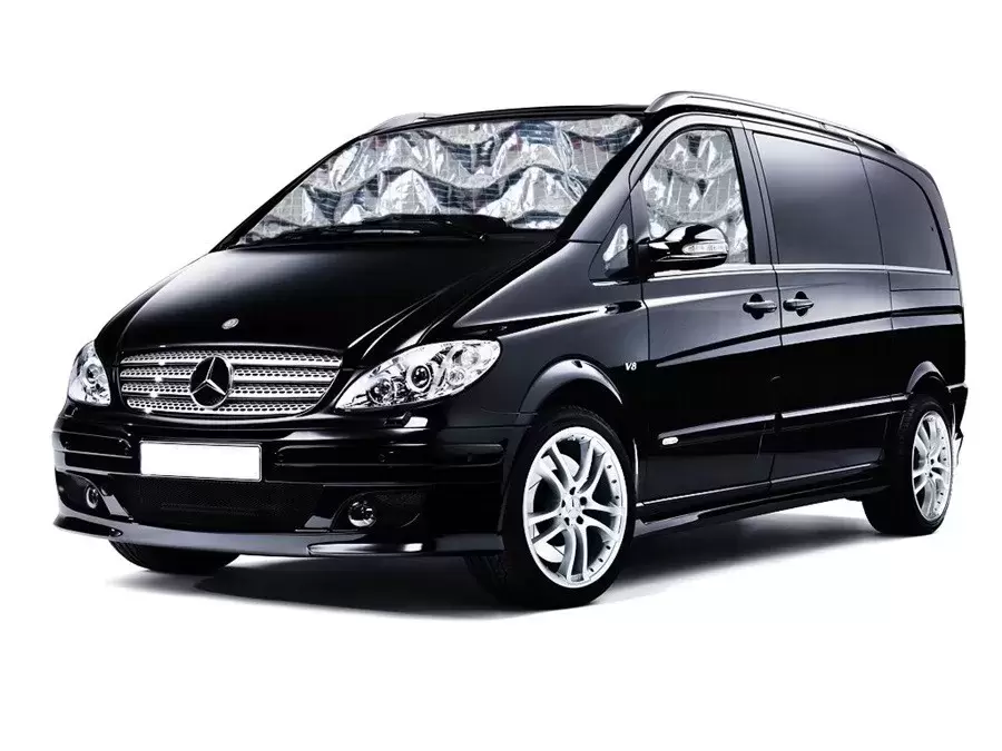 Protector termico para Mercedes Viano, protege tanto del calor como del frio, compuesto por una pieza para la luneta frontal, dos para la ventanillas laterales y los dos pequeños triangulitos de la parte inferior de la ventana.