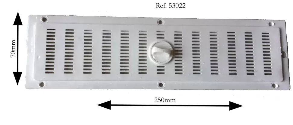 Rejilla utilizada en puerta de autocaravana para salida de gases y ventilación, con posibilidad de abrir o cerrar.