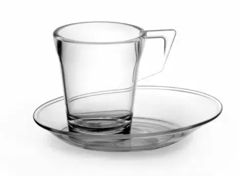 Taza de café expreso 9cl con plato transparente de policarbonato muy resistente. Apto para electrodomésticos.